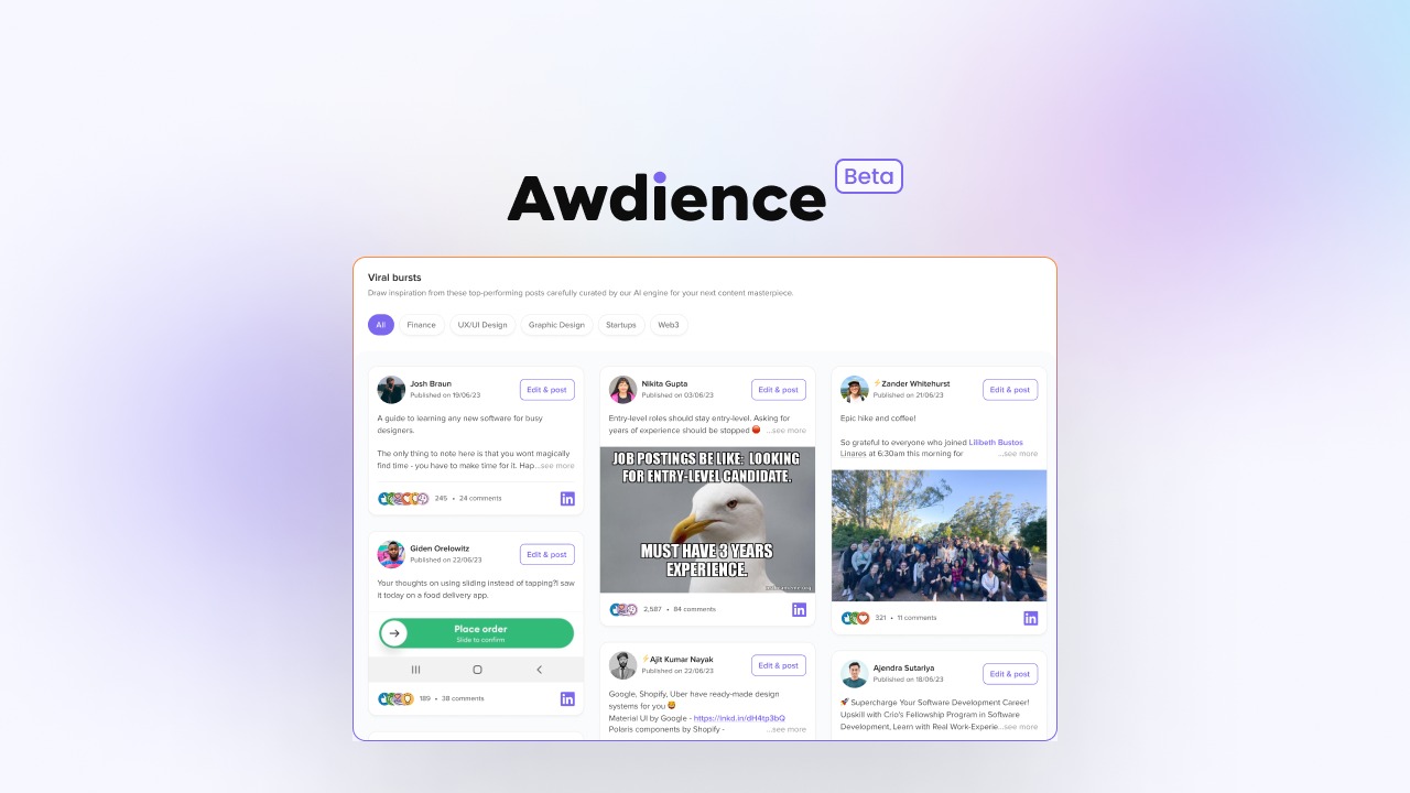 With Awdience, you can access a never-ending stream of content ideas, including viral posts and the latest industry news.