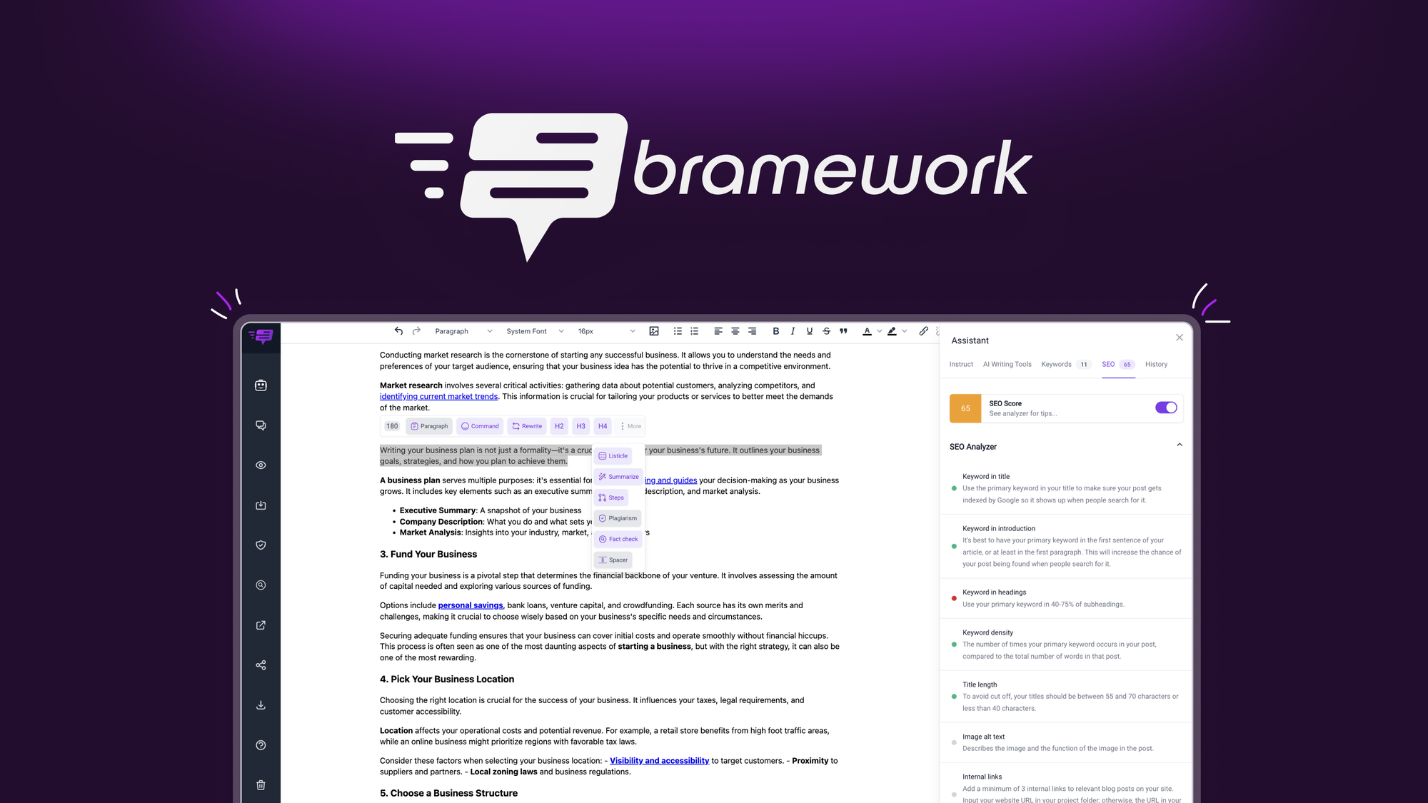 Bramework is an AI-powered blogging tool that makes it easy to research keywords and write SEO-friendly blog content quickly.