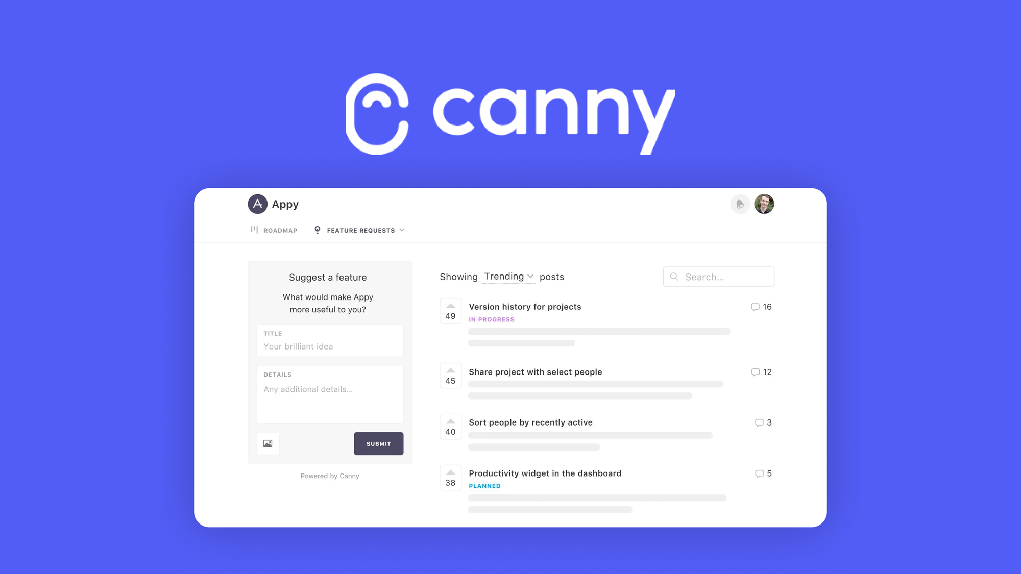 Canny is a customer feedback management software for entrepreneurs and marketers. It helps you navigate the sea of user insights, transforming them into actionable strategies. Canny curates feedback, empowering you to make informed choices. Unearth valuable suggestions from customers and collaborators, and turn them into features that resonate. Effortlessly prioritize with a roadmap that integrates seamlessly with tools like Jira and Asana. With Canny, you're not just building products; you're fostering connections. Keep users engaged with automatic updates, strengthen relationships, and cultivate loyalty. The result? A customer experience that outshines the rest.