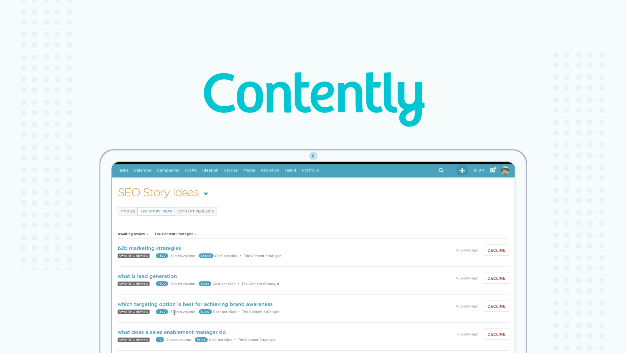 Contently's content Ideation Tools algorithmically feed you story concepts that are likely to perform well in search based on your brand and content strategy. It's a content intelligence tool that tells you exactly what topics, formats, channels, and tone of voice will engage your audience.