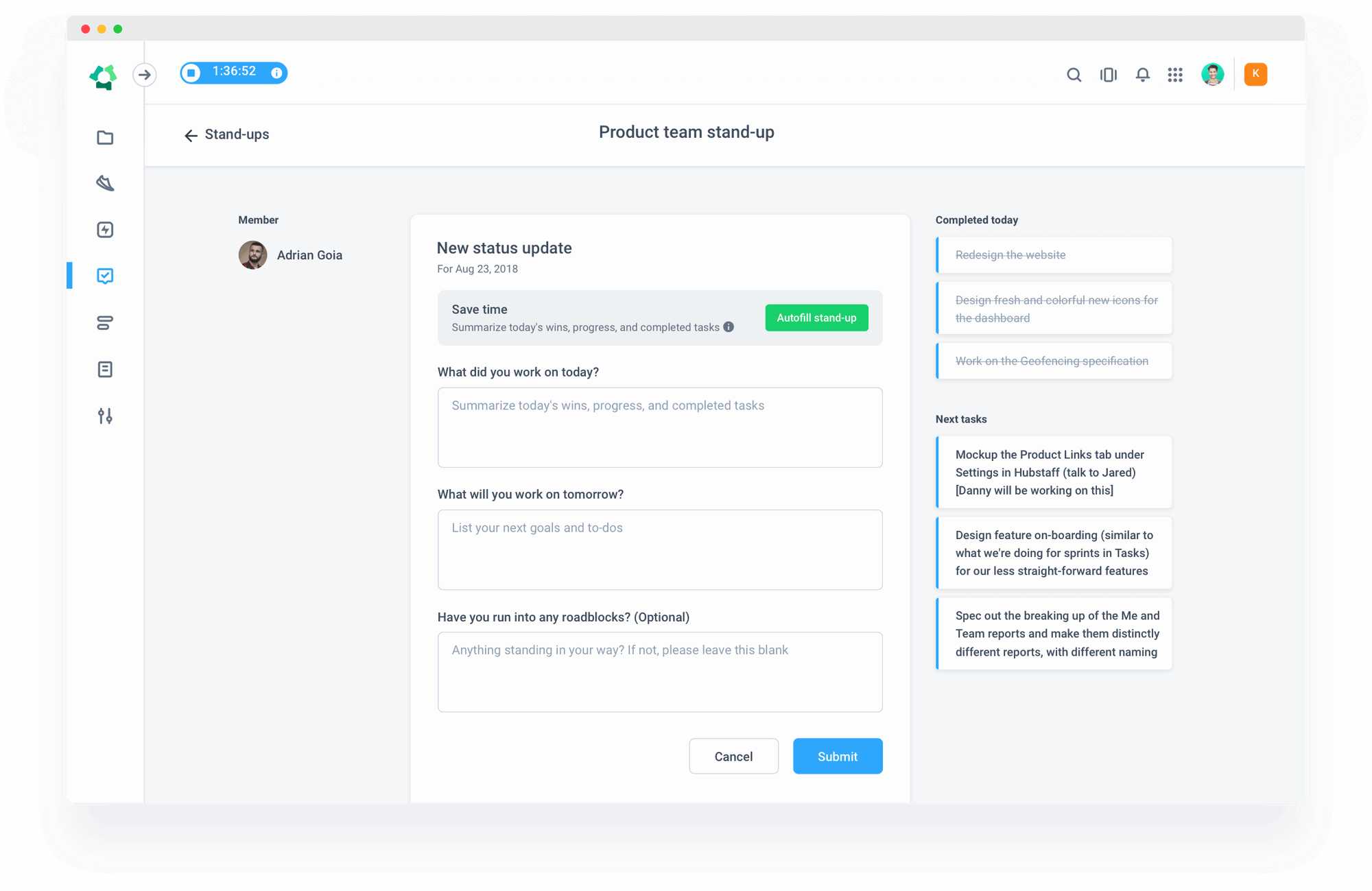 Hubstaff Tasks’ automated stand-ups functionality lets you keep your group posted on cross-team projects so you’re always on the same page.