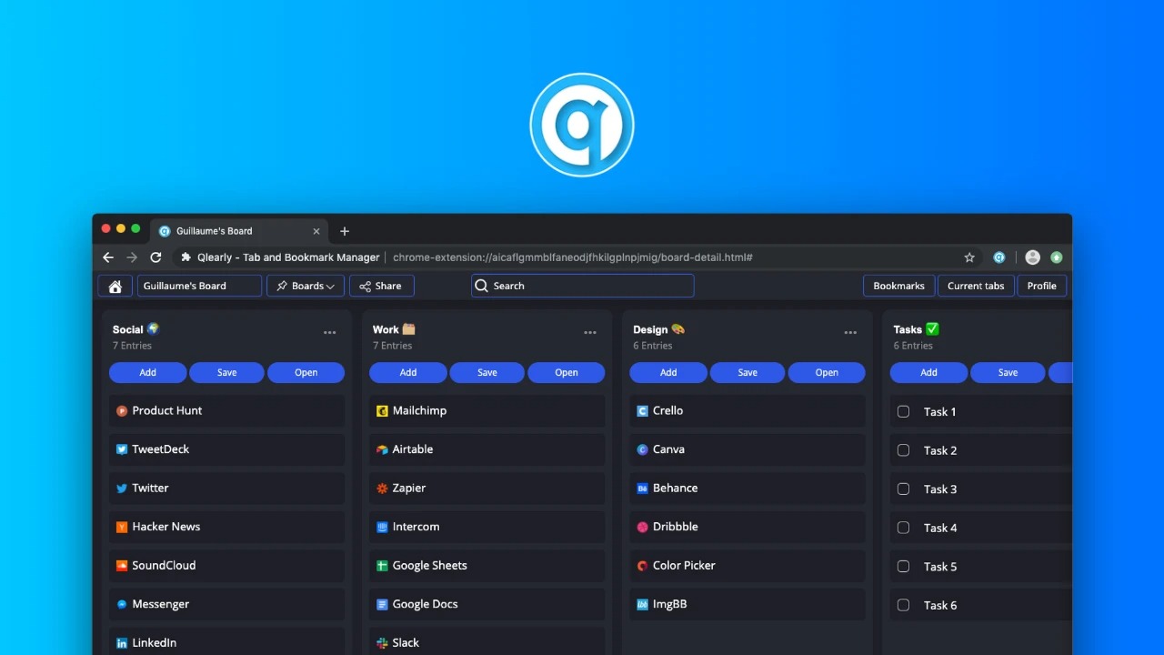 Organize your bookmarks, tasks, and notes by boards and columns.