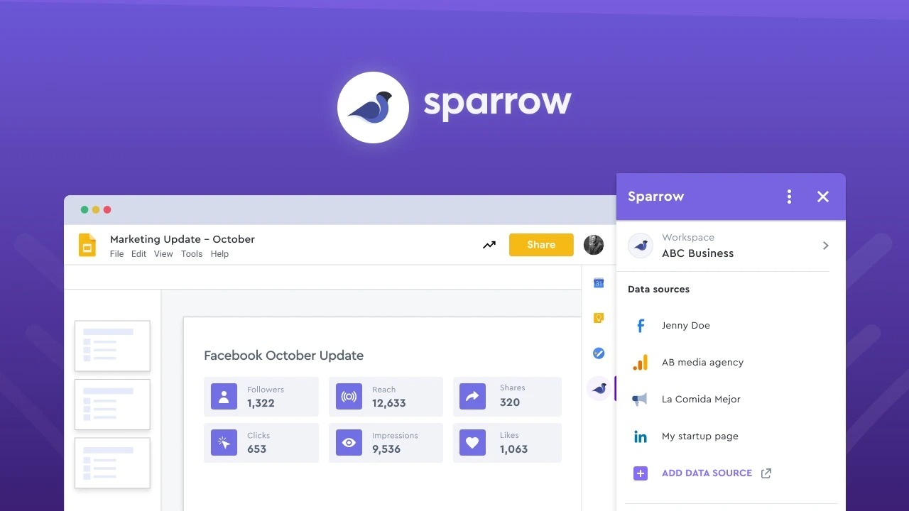 Sync your marketing data to Google Sheets™ and Google Slides™ and automate reporting with the Sparrow Google Workspace™ add-on.